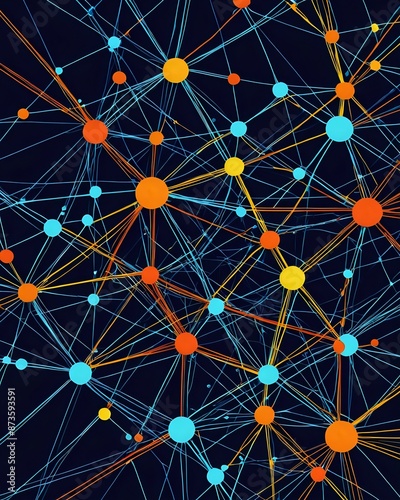 network, connection, node, dot, line, abstract, digital, technology, cyberspace, communication, datum, web, graph, futuristic, modern, science, design, illustration, background, pattern, colourful, blue, orange, yellow