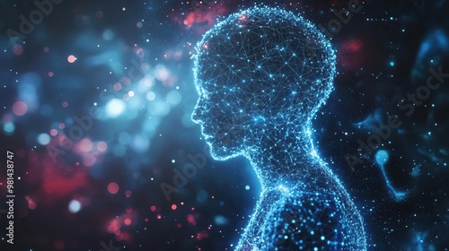 abstract network of luminous interconnected nodes forming human silhouette against deep space backdrop vibrant data streams cosmic dust neural network concept holographic interface
