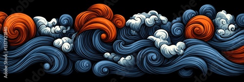 abstract, ocean, wave, sea, water, art, design, graphic, illustration, pattern, background, wallpaper, texture, swirl, dynamic, colourful, vibrant, blue, orange, red, sun, cloud, nature, artistic, decorative, style, vector, graphic design, digital artwork, modern, ornamental, detailed, textured, feng shui, japanese, asian, oriental, sky