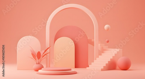 background, abstract, arch, arch, geometric, shape, minimal, modern, clean, stair, staircase, platform, dais, stage, display stand, presentation, template, design, illustration, studio, scene, coral, peach, rose, pink, soft, light, colours, tone, gradient, smooth, curve, round, sphere, ball, plant, leaf, pot, decorative, elegant, stylish, beauty, cosmetic