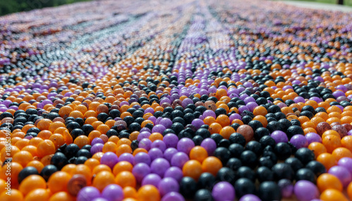 Abstract Pattern Background of Bright Orange, Black, and Purple Sprinkles or Beads. Halloween Colors
