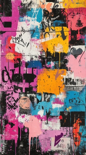abstract pattern in vibrant colors, showcasing layers of paint, stencils, and spray-painted graffiti