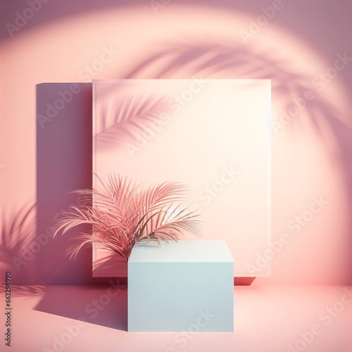 Abstract pink room with composition of Podium and palm leaves for product presentation. Soft studio light, vaporwave style.