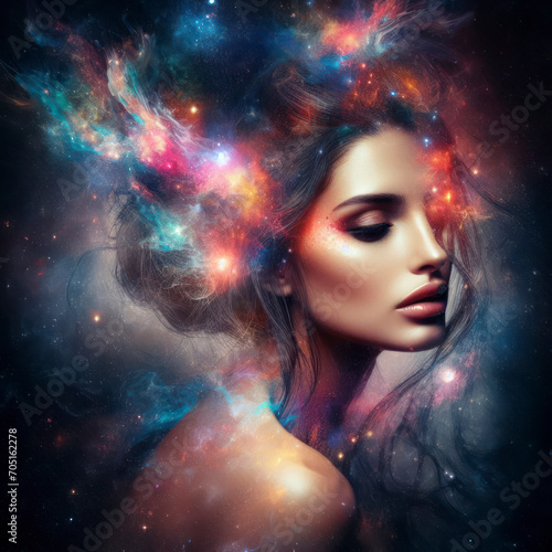 abstract portrait of a woman double exposure with a colorful digital paint splash or space nebula. ai generative