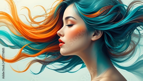 dreamy, lip, profile, coiffure, mood, movement, flowing, gorgeous, fantasy, trendy, vibrant, stylish, eye, model, artistic, expression, graphic, elegant, teal, pretty, digital artwork, make up, face, female, hair, illustration, coiffure, portrait, woman, art, modern, abstract, orange, design, style, fashion, texture, creative, colourful, beauty, colours, abstract art