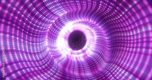 Abstract purple energy tunnel made of particles and a grid of high-tech lines with a glowing background effect