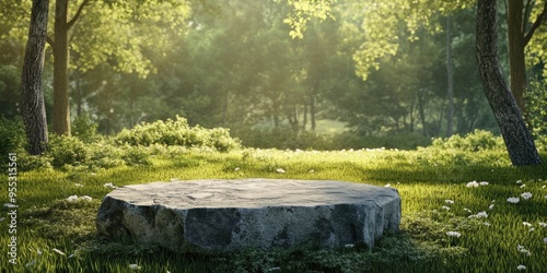 abstract, realistic, three-dimensional, render, spring, setting, stone, dais, grassy, field, forest, product, presentation, advertising, nature, environment, display, showcase, landscape, scene, summer, daylight, vibrant, colours, creative, design, modern, composition, aesthetic, freshness, calmness, greenery, seasonal, visual, pedestal, promotional, marketing, artistic, concept, illustration, photo, imagery, foreground, background