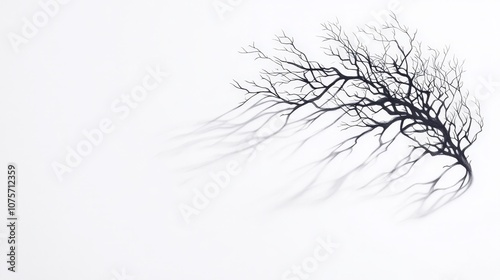 Abstract representation of a barren tree branch casting intricate shadows on a minimalist white background, portraying themes of isolation and nature’s beauty.