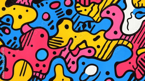 abstract, art, background, bright, blue, pink, yellow, white, black, shape, pattern, design, colourful, graphic, illustration, modern, contemporary, fun, vibrant, artistic, creative, playful, pop, artwork, organic, fluid, blob, form, curve, line, dot, circle, decoration, decorative, textile, wallpaper, surface, texture, drawing, doodle, hand-drawn, marker, paint, bold, seamless, repeat, trendy