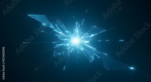 abstract, explosion, digital artwork, background, texture, cyan, blue, glowing, light, energy, futuristic, technology, science fiction, geometric, polygonal, design element, graphic, illustration, broken glass, impact, crash, spark, shine, bright, dark background, motion blur, dynamic, intense