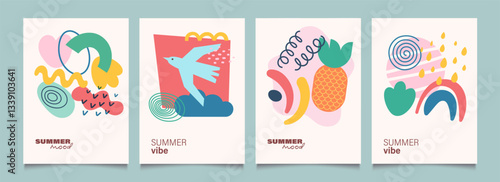 Abstract summer backgrounds with icons or shapes in flat design. Vacation mood. Modern geometric vector illustrations. Trendy posters, cards, banners, print on shirts.