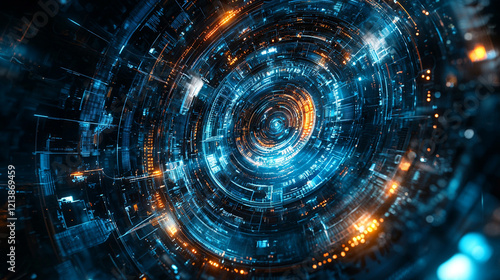 technology, digital, abstract, futuristic, circle, swirl, datum, network, connection, innovation, science, background, design, pattern, texture, light, glow, energy, motion, speed, progress, modern, complex, intricate, electronic, circuit, system, communication, information, cyberspace, web, virtual, reality, space, cosmos, universe, galaxy, electric, power, signal, wire, line, blue, orange, dark