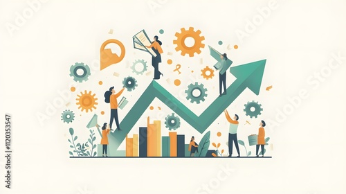 teamwork, concept, arrow, upward, gear, book, collaboration, abstract, illustration, growth, success, progress, planning, creative, strategy, idea, improvement, development, cooperation, goal, modern, colourful, education, business, achievement, productivity, cognition, finance, partnership
