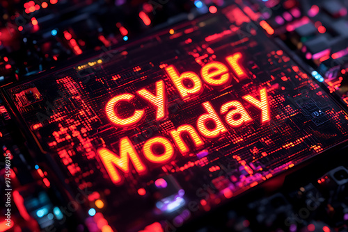 Abstract tech dark background with glowing binary code and neon accents, featuring bold "CYBER MONDAY" text in the center.