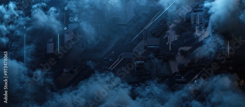 Abstract technology background featuring a dark blue circuit board with clouds and smoke rising illustrating a tech or digital future concept