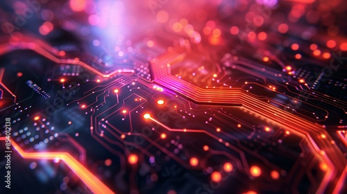 Abstract technology background featuring a vibrant, illuminated circuit board with red and purple light highlights.