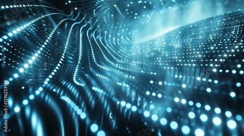 Abstract technology background showing a perspective view into a swirling tunnel or flow of glowing blue digital dots on a dark surface. Data transfer concept.