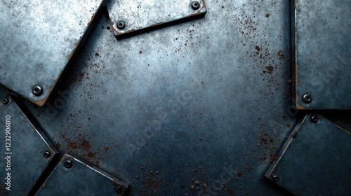 Abstract Textured Metal Surface with Bolted Panels and Rust Spattering