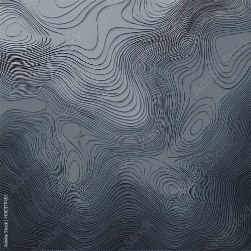 Abstract topographic map background with dark gray cover, curved layers, elevation contour lines, and dark-colored mountains and hills in a papercut art style illustration