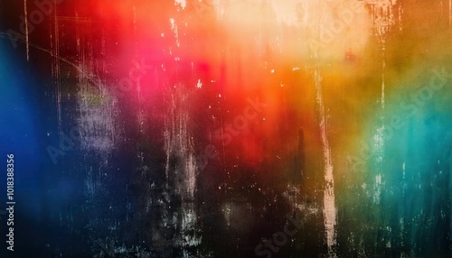 Abstract Urban Skyline at Sunset. Blurred Multicolored Cityscape Through Glass with Vibrant Hues of Yellow, Red, and Teal