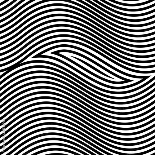 Abstract vector seamless op art pattern. Monochrome graphic black and white ornament. Striped optical illusion repeating texture.