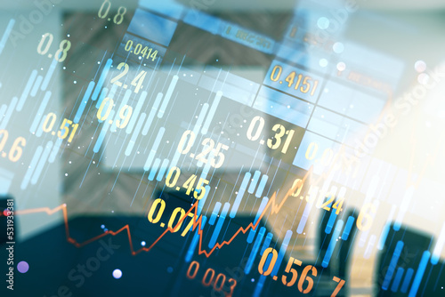 Abstract virtual financial graph hologram on a modern furnished classroom background, financial and trading concept. Multiexposure