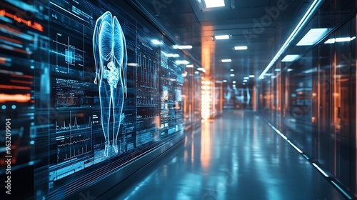 Abstract virtual medical hologram on modern architecture background online medical consulting concept Multiexposure : Generative AI