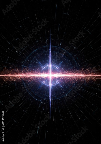 Abstract visualization of quantum energy flow using glowing geometric patterns and complex rhythmic light waves across a dark void, light, frequency, physics