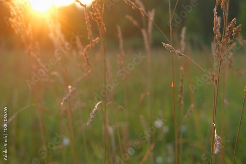 Abstract warm landscape of wildflower grass meadow on warm golden hour sunset or sunrise time. Tranquil summer or early fall nature field background. Soft golden hour sunlight panoramic countryside