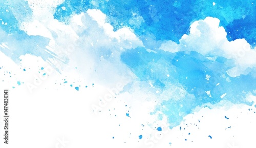 Abstract watercolor painting of vibrant blue and white clouds. Soft, blended hues create a dreamy sky effect with scattered, light splotches of color
