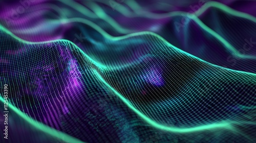 Abstract wavy grid pattern in neon green and purple hues, forming a futuristic and dynamic surface resembling a digital terrain. AI generative.