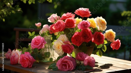 abundance, rose, table, illustration, garden, photograph, rustic, greenery, sunlight, arrangement, pink, red, yellow, sprig, vibrant, colours, wood, verdant, lively, inviting, essence, summer, party, rich, full, diversity