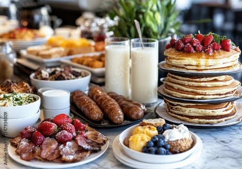 Abundant Breakfast Display with Pancakes, Fresh Fruits, Sausages, and Creamy Smoothies Served in a Modern Setting Ideal for Weekend Brunch Gatherings