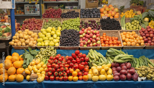 farmers market, fruit, fresh produce, orange, apple, pear, tomatoes, grape, banana, abundance, variety, health food, natural food, agriculture, harvest, delicious, vitamin, nourishment, diet, summer, food market, retail, organic, market, stall, basket, crate, display, racked, closeup, overhead, view, food, selection, vibrant, colours, seller, nourishment, well-being, raw, eating, cookery, vegetarian, plant, based, photo, freshness, juicy