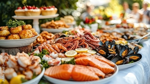 seafood, buffet, salmon, shrimp, mussel, octopus, fish, prawn, seafood, lobster, crab, oyster, clam, scallop, food, dinner, lunch, party, celebration, banquet, catering, eatery, hotel, event, table, platter, delicious, fresh, healthy, epicure, accessing, summer, garden, feast, widener, variety, abundance, delicacy, cookery, meal, plate, serving, tasty, appetising, culinary