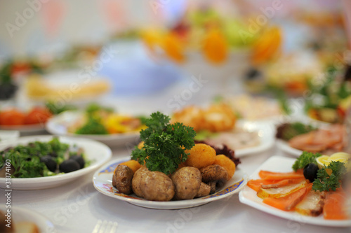 food, cooking, meal, mushroom, dish, anniversary, banquet, breakfast, celebration, closeup, decoration, delicious, diet, dining, dinner, eating, elegant, event, expensive, fresh, garnish, glasses, epicure, green, holiday, ravenous, interior, lunch, luxury, party, plate, eatery, sausage, service, snack, table, tablecloth, tasteful, tasty, vegetable, wedding, white, yellow, salad, utensil
