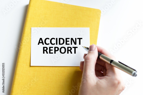 Accident Report inscription on a card against the background of a notepad on the table next to the hand of a businessman with a pen writes text