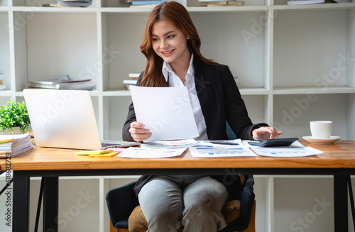 accountant, Auditor, Self-Employed, Finance and Investment, tax calculation and budget, Portrait of Asian female entrepreneur using a calculator to calculate. Company business results document.