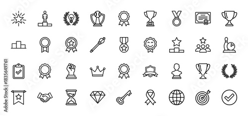 achievement, success, vector, icon, set, line, outline, reward, award, competition, trophy, medal, champion, winner, prize, excellence, quality, goal, celebration, progress, first, second, third, dais, certificate, ribbon, laurel, crown, diamond, handshake, hourglass, target, checklist, banner, monochrome, minimal, collection, pictogram, editable, graphic, illustration, symbol, isolated, abstract, element