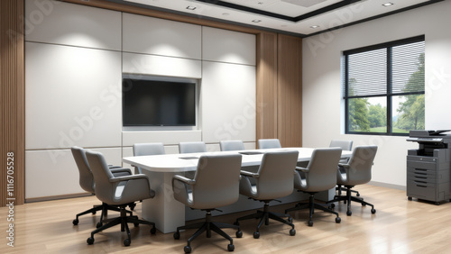 Acoustic boardroom meeting room with office chairs around a conference table.