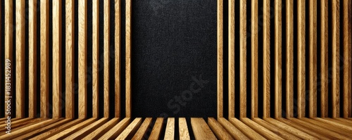 Acoustic wood panel wall with black cloth concept. Elegant wooden interior design featuring vertical slats.