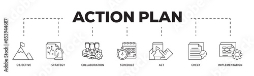 Action plan icon infographic illustration concept with icon of objective, strategy, collaboration, schedule, act, launch, check, and implementation icon live stroke and easy to edit