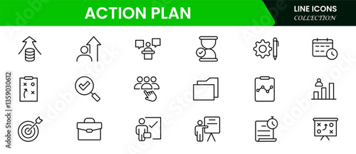 Action plan icon set. Containing planning, schedule, strategy, analysis, tasks, goal, collaboration, and objective icons. Vector illustration collection.