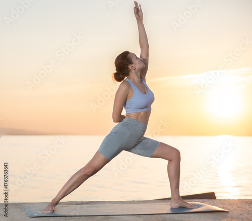 Active experienced woman fitness club teacher performs yoga asana on mat on seashore at sunset outdoors. Concept of healthy lifestyle