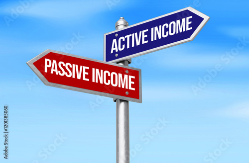 Active Income vs Passive Income written on the red and blue signboard pointing in opposite direction. Business and finance concept representing income streams