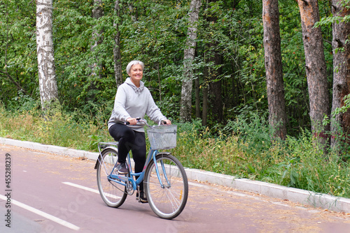 Active senior caucasian woman with gray hair is riding bike on bicycle path in forest park.