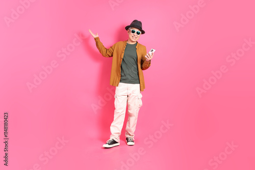 person, adult, man, male, communication, technology, lifestyle, looking, senior, isolated, mobile phone, wireless technology, adults only, one person, phone, asian, studio shot, older, smartphone, japanese ethnicity, hot pink, full-length, sunglasses, fashionable, concept, showing, holding, giving, open, empty, hand, carrying, gesticulate