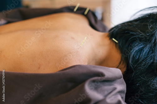 Acupuncture session in Japanese medical study. Young woman is lying on a mat while the operator inserts needles