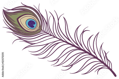 Adobe IllustratoPhotorealistic peacock feather, intricate detail, iridescent colors, purple plume, green and blue eyespot, golden brown accents, single feather, white background, high contrasr Artwork