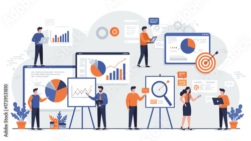 vector, illustration, design element, business, analysis, datum, marketing, finance, strategy, report, chart, graph, presentation, meeting, team, teamwork, collaboration, people, professional, infographic, diagram, statistic, research, development, growth, success, target, goal, achievement, project, management, laptop, computer, screen, web, online, digital, corporate, startup, consulting, solution, concept, planning, document, information